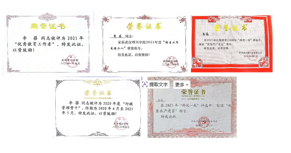个人荣誉:在校期间,多次荣获三好学生、优秀学生干部等各项荣誉;2020年被评为武汉晴川学院“行政管理骨干”;2021年被评为武汉晴川学院“优秀教育工作者”“招生工作先进个人”,并在2021年、2025年两次荣获学校“两优一先”评选的“优秀共产党员”称号。