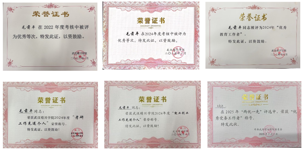 荣获武汉晴川学院2024年度“考研工作先进个人”荣誉称号。