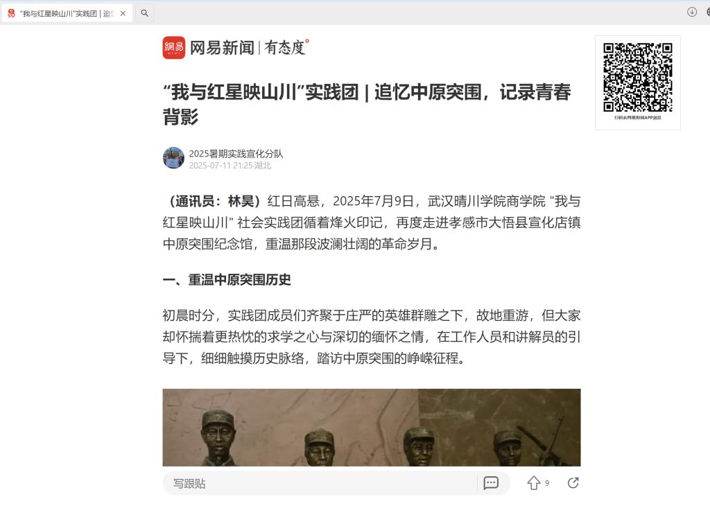 网易新闻讯(通讯员:林昊)红日高悬,2025年7月9日,武汉晴川学院商学院 "我与红星映山川" 社会实践团循着烽火印记,再度走进孝感市大悟县宣化店镇中原突围纪念馆,重温那段波澜壮阔的革命岁月。