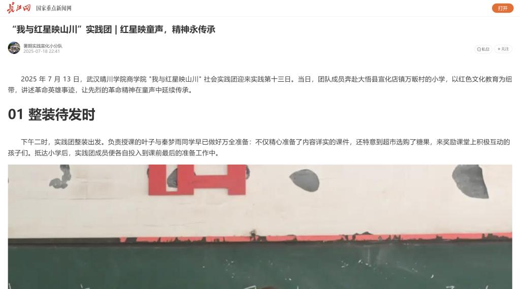 长江网讯 2025 年 7 月 13 日,武汉晴川学院商学院 "我与红星映山川" 社会实践团迎来实践第十三日。当日,团队成员奔赴大悟县宣化店镇万畈村的小学,以红色文化教育为纽带,讲述革命英雄事迹,让先烈的革命精神在童声中延续传承。