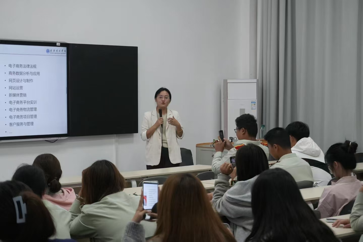当2025级新生在教一各教室有序落座,主讲老师也随即宣布本次专业介绍会正式拉开帷幕。姚春荣老师首先为电子商务专业的新生介绍了专业课程体系。随后,她给同学们讲解了商学院关于电子商务专业的培养方案,阐释了专业课程如何精准契合武汉晴川学院“应用型人才”培养定位,并为学生们勾勒出了清晰的专业学习蓝图。