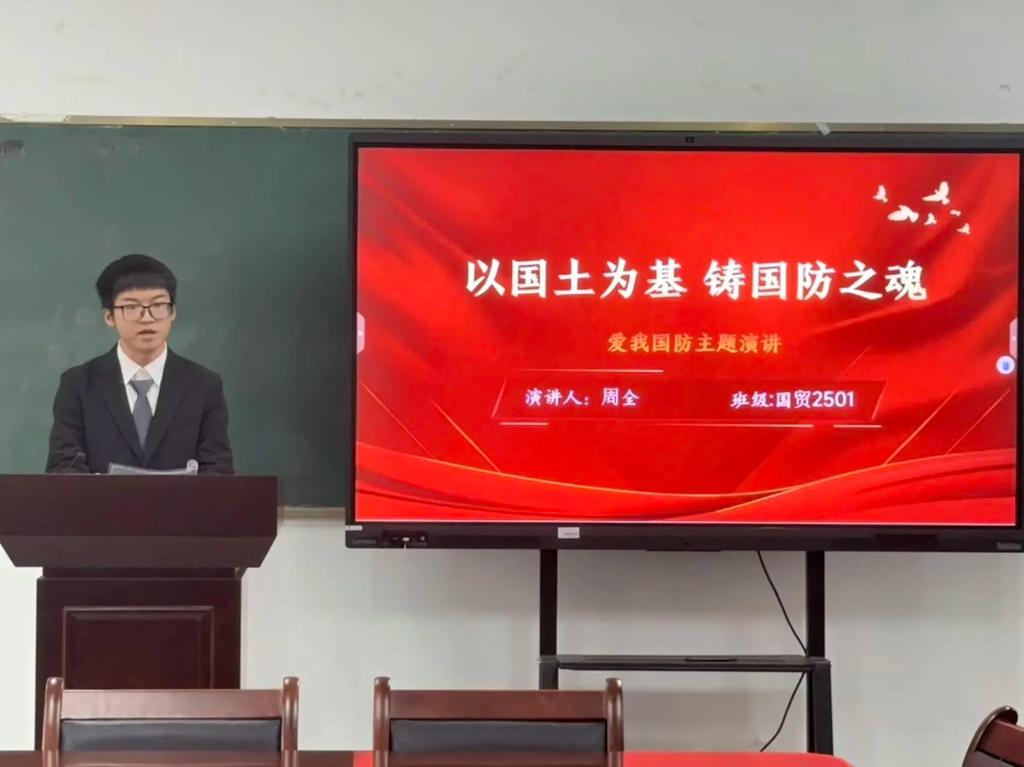 首先登场的2025级电子商务专业的郑祺航同学。他以《让青春在强国兴国中闪光》为题,通过讲述革命先烈保家卫国的英雄事迹,呼吁同学们铭记历史、珍惜当下。他慷慨激昂的语调与饱含深情的表达,赢得现场阵阵掌声。紧接着,2025级国际经济与贸易专业周全同学结合俄乌冲突等国际热点,强调"以国土为基,铸国防之魂",其犀利的观点引发在场师生强烈共鸣。