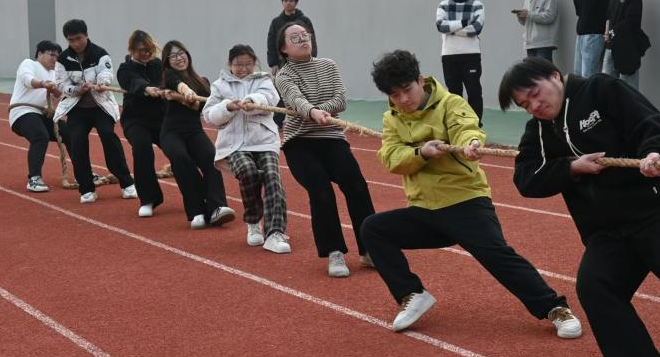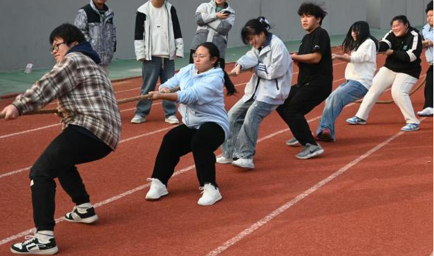 整场运动会的高潮,当属压轴的拔河比赛。结对的党员学姐们主动牵头组队,细心安排队员们的站位,还带头握紧麻绳站在队伍前排。粗壮的麻绳被双方队员拉得笔直,中间的红布在界线两侧来回移动,紧张的气氛瞬间拉满。参赛同学个个身体后倾,双脚死死蹬住地面,脸庞因用力而涨得通红,拼尽全身力气往后拉。班级里的同学们自发组成啦啦队,站在队伍两侧整齐地喊起口号,全班同学节奏统一,齐心协力向着同一个方向发力。每一次红布的轻微移动,都伴随着现场观惊呼与呐喊,赛场氛围热烈到了顶点。